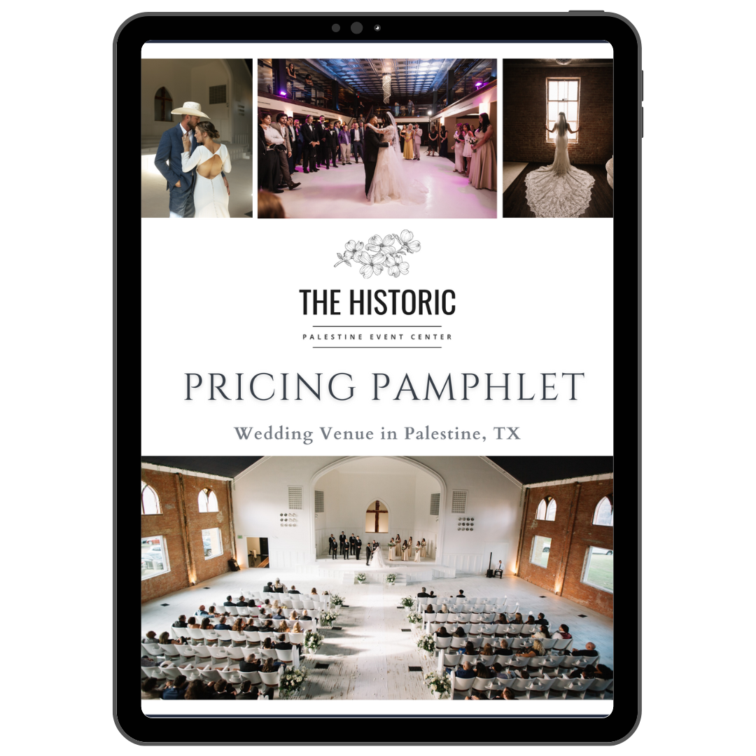 This pricing pamphlet will give you a taste of The Historic Palestine Event Center wedding experience while in the comfort of your own home! Packed with pricing, packages, amenities, and much more!